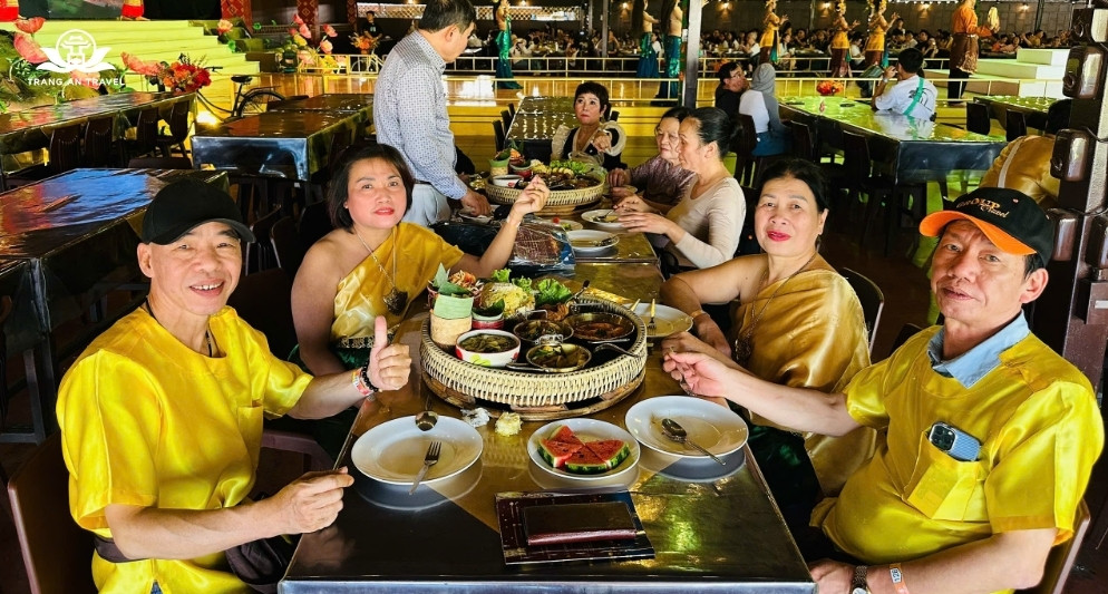 Du khách trong đoàn thưởng thức ẩm thực Thái Lan (trong đó có món Khan Tok, của Hoàng gia Thái Lan, buffet trái cây nhiệt đới)...