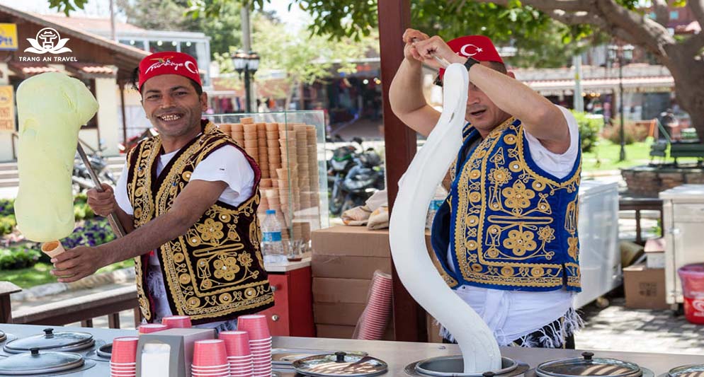 Tưởng như chẳng có gì nhưng kem ốc quế lại trở thành món ăn 'quốc dân' đáng thử khi du lịch Thổ Nhĩ Kỳ. Ở các tuyến phố đi bộ hoặc điểm tham quan, bạn sẽ thấy những chàng trai mặc trang phục truyền thống đứng “múa kem” như múa quạt trên tay. Chỉ với 15.000 VNĐ – 30.000 VNĐ một chiếc, hàng chục hương vị hấp dẫn để du khách lựa chọn, trong đó một số như blueberry, óc chó khá ít gặp ở Việt Nam.