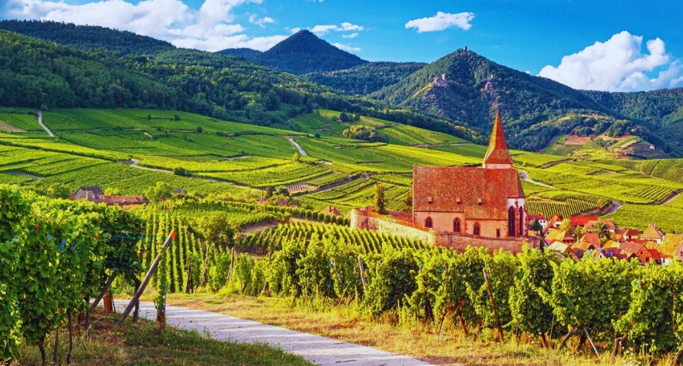 Nằm ở vùng đông bắc nước Pháp, cung đường Alsace Wine Route kéo dài khoảng 170km từ Strasbourg đến Colmar, đưa du khách qua những ngôi làng cổ đầy màu sắc, những vườn nho xanh mướt và những lâu đài tráng lệ. Đặc biệt vào mùa thu, những cánh đồng nho chuyển sang sắc vàng và đỏ, tạo nên một khung cảnh lãng mạn và thơ mộng.