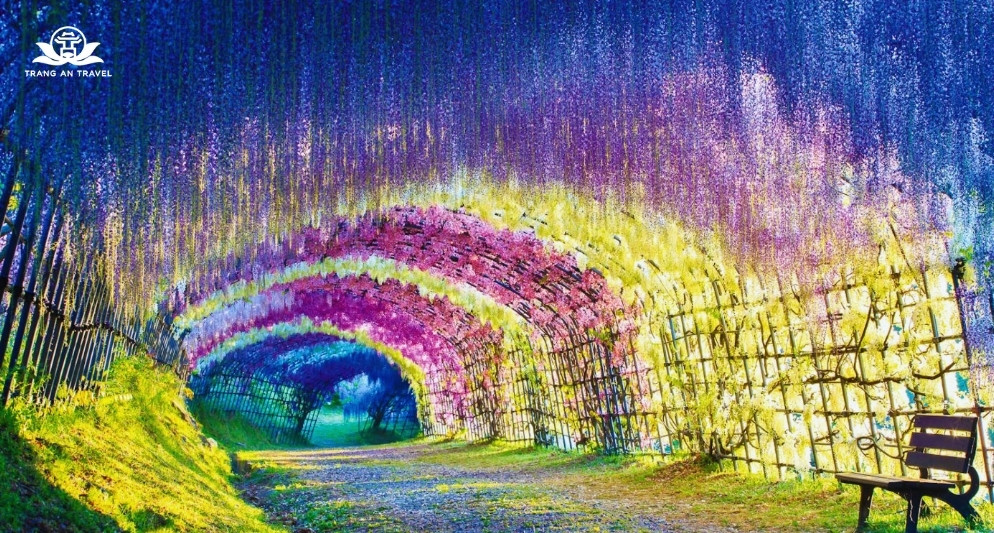 Kawachi Fujien biết đến với đường hầm hoa tử đằng nổi tiếng bậc nhất Nhật Bản. Nơi đây sở hữu hơn 150 cây hoa tử đằng thuộc 20 giống khác nhau, tạo nên bức tranh đầy màu sắc khi bước vào mùa nở rộ. Con đường tạo nên từ những chùm hoa phủ kín phía trên sẽ đưa bạn vào không gian như mơ, khó lòng rời mắt.