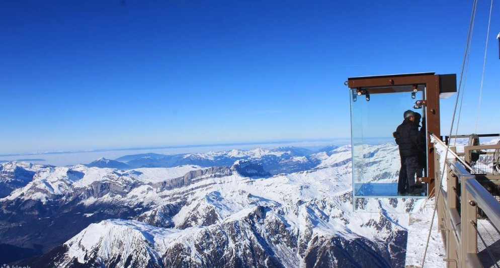 Khi lên đến Aiguille du Midi, du khách có thể thử cảm giác “Bước vào khoảng không” (Step into the Void) – một ô kính trong suốt nhô ra ngoài vách núi, mang lại trải nghiệm hồi hộp nhưng đầy hấp dẫn.
