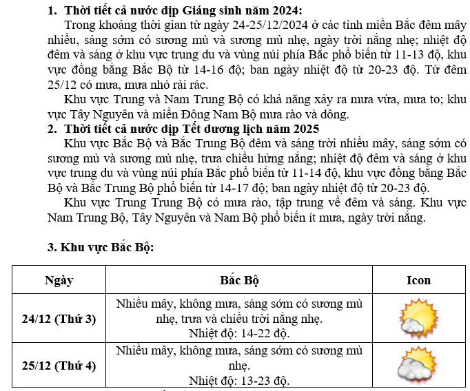 Dịp Giáng sinh 2024, Nam Bộ, Nam Trung Bộ và Tây Nguyên khả năng mưa nhiều nơi do ảnh hưởng từ gió mùa Đông bắc và hoàn lưu sau suy yếu từ bão số 10...