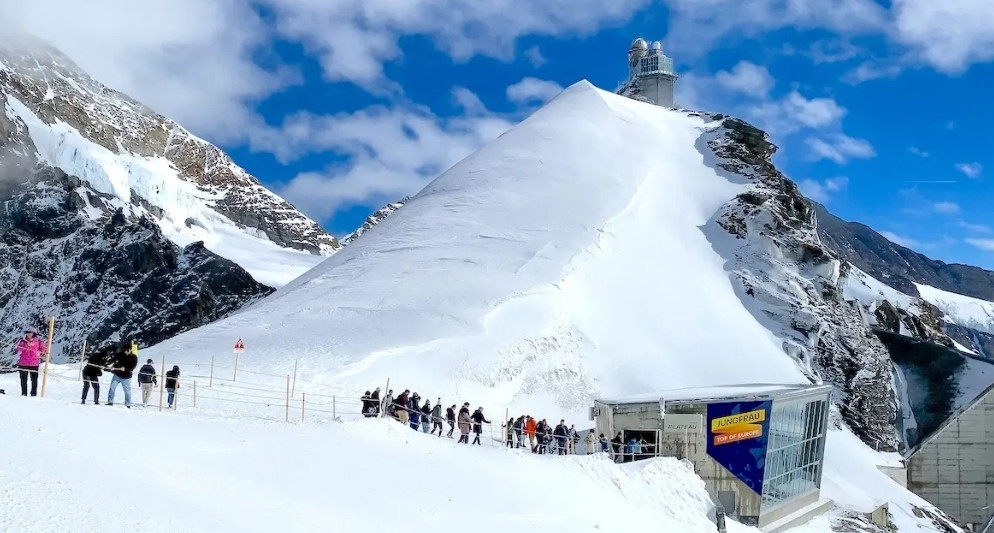 Jungfraujoch mệnh danh là "Nóc nhà của châu Âu", là đỉnh núi cao 3.454 m nằm giữa dãy Alps Thụy Sĩ. Để đến đây, du khách trong tour châu Âu giá tốt Tràng An Travel với thời gian 15 ngày 14 đêm, 8 nước sẽ có cơ hội đi tuyến cáp treo Eiger Express, một trong những hệ thống cáp treo hiện đại, nhanh nhất ở châu Âu.